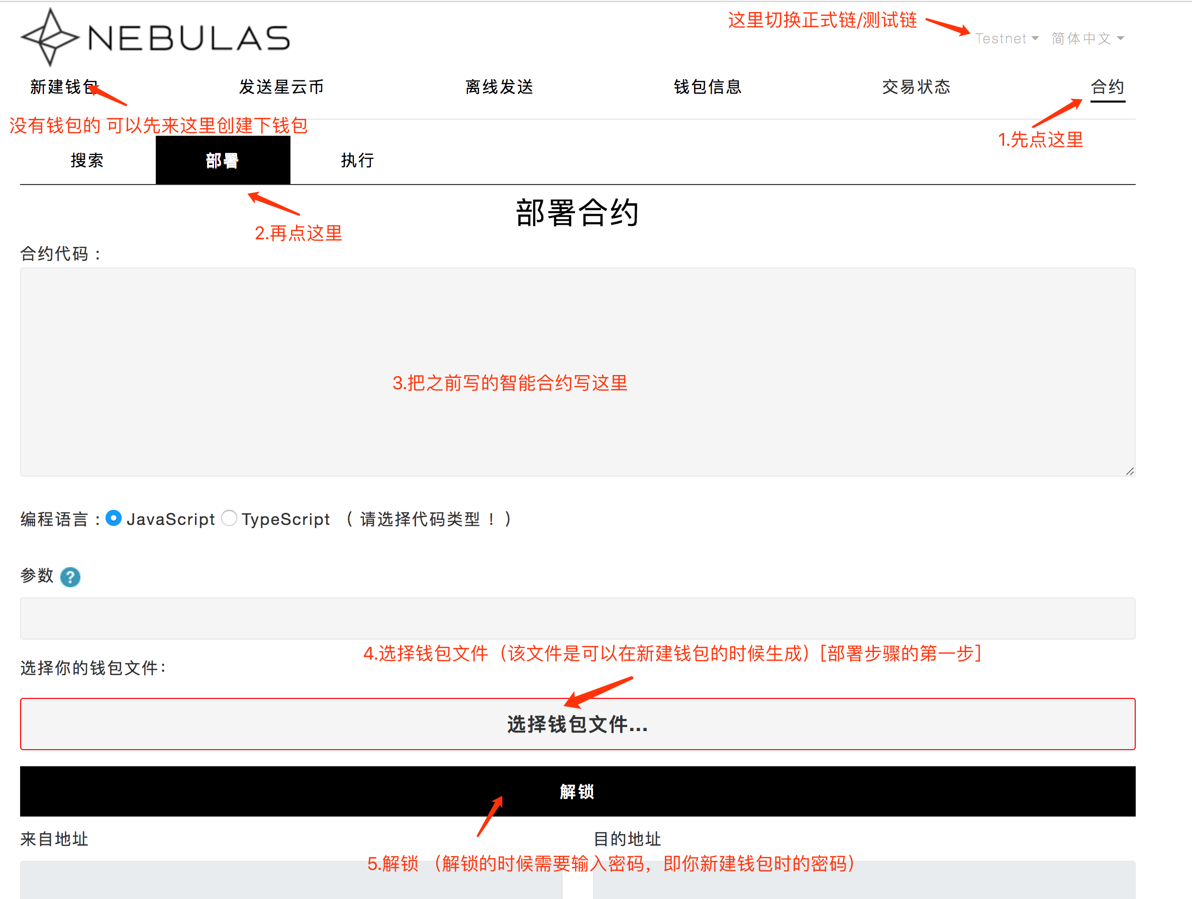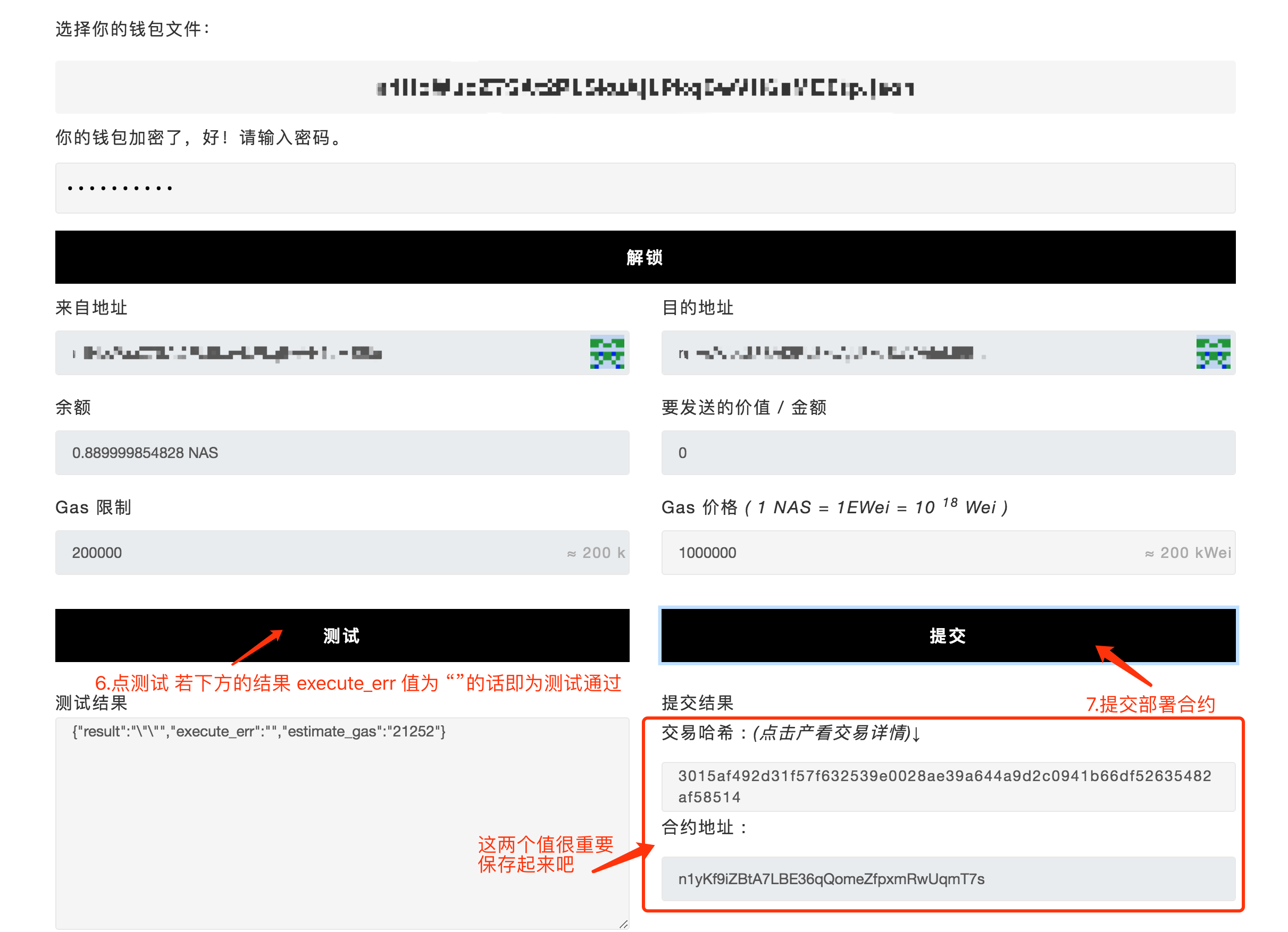- 部署智能合约,(部署合约的时候需要少量的NAS, 测试链上的币可以在这里领取,正式链上的NAS,如果没有渠道的话,可以联系我微信